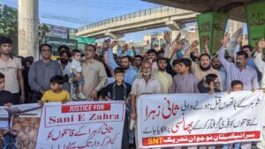 تک نہیں لکھ سکی اور ملزمان ابھی تک عبوری ضمانت پر باہر پھر رہے ہیں سول سوسائٹی کے نمائندوں نے حکومت اور عدلیہ سے مطالبہ کیا کہ وہ ثانیہ زہرا کے قتل کا فوری انصاف کریں اور قاتلوں کو کیفر کردار تک پہنچایا جائے بصورت دیگر سول سوسائٹی ملک بھر میں احتجاج کرنے پر مجبور ہو جائے گی ۔ثانیہ زہرا کے والد سید اسد عباس شاہ نے کہا کہ پولیس نے میری بیٹی کے قتل کے ساتھ انصاف نہیں کیا پولیس کی وجہ سے میری معصوم بیٹی کے قاتل ساڑھے تین ماہ سے دندناتے پھر رہے ہیں اور اسلحہ کی نمائش کر رہے مگر پولیس ان کے خلاف کاروائی نہیں کر رہی۔سید اسد عباس شاہ نے کہا کہ جب تک میری بیٹی کو انصاف نہیں ملتا میں آرام سے نہیں بیٹھوں گا اور اگر پولیس نے میری معصوم بیٹی کے قاتلوں کو فائدہ پہنچایا تو میں چوک کمہارانوالہ پر مستقل دھرنا دے دونگا ۔ثانیہ زہرا کی والدہ سیدہ حنا زہرا بخاری نے کہا کہ میں مر مر کر جی رہی ہوں میری معصوم بیٹی کے قاتلوں کو پھانسی دی جائے بصورت دیگر میں خواتین کے ساتھ دھرنا دوں گی ۔علامہ قاضی نادر حسین ،عبدالرحمان فری ۔حافظ شہزاد و دیگر نے کہا کہ جب ثانیہ زہرا کے والدین کو انصاف نہیں ملتا ہم سب سید اسد عباس شاہ کے ساتھ کھڑے ہیں ہم ہر مظاہرے اور ہر دھرنے میں شرکت کریں گے ۔مظاہرے میں سول سوسائٹی ،طلباء تنطیموں ،تاجر برادری ،مزدور اتحاد سمیت سینکڑوں مرد و خواتین نے شرکت کی