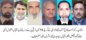 ملتان : وزیر اعلی پنجاب اور صوبائی سلیکشن بورڈ پنجاب کی منظوری کے بعد ایس اینڈ جی اے ڈی نے ٹیوٹا پنجاب کے زیر نگرانی پنجاب بھر کے گورنمنٹ کالجز آف ٹیکنالوجی (سول سرونٹ ) کے24سنئیر انسٹرکٹرز کو بطور چیف انسٹرکٹر گریڈ19میں ترقی دینے کا نوٹیفیکشن جاری کر دیا ہے، جس میں گورنمنٹ کالج آف ٹیکنالوجی ملتان کے ترقی پانے والوں میں نوید اقبال ملک شعبہ الیکٹریکل، چوہدری اسلم حنیف سنگھیڑا چوہدری محمد اشرف شعبہ کیمیکل، شیخ محمد مقبول الٰہی ،خالد محمود فیصل ،ظفر اقبال شعبہ مکینیکل، جبکہ محمد آصف ، سید وقار حسین شاہ شعبہ ٹیکسٹائل شامل ہیں، تعلیمی اور سماجی حلقوں نے اس ترقی پر اساتذہ کرام کو مبارک باد پیش کی ہے