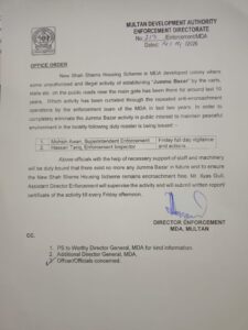 اس سلسلے میں ایک باقاعدہ ڈیوٹی روسٹر بھی جاری کیا گیا ہے، جس کے تحت محسن اعوان، سپرنٹنڈنٹ انفورسمنٹ کو جمعہ کے روز مکمل نگرانی (ویجیلنس) کی ذمہ داری سونپی گئی ہے، جبکہ حسن طارق، انفورسمنٹ انسپکٹر کو عملی کارروائیوں کا پابند بنایا گیا ہے۔ متعلقہ افسران کو ہدایت کی گئی ہے کہ وہ عملے اور مشینری کی معاونت سے اس امر کو یقینی بنائیں کہ آئندہ کسی بھی صورت میں جمعہ بازار قائم نہ ہو اور نیو شاہ شمس ہاؤسنگ اسکیم کو مکمل طور پر تجاوزات سے پاک رکھا جائے۔