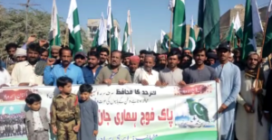 جیکب آباد سول سوسائٹی اور ایری قوم کی جانب سے سبز حلالی پرچم اٹھا کر پاک افواج کی حمایت میں ریلی نکالی گئی