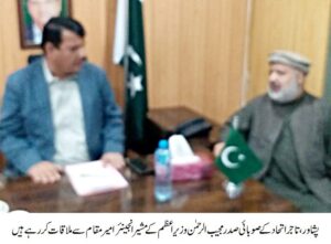 تاجراتحادخیبرپختونخوا صدر مجیب الرحمن کے ہمراہ جنرل سیکٹری میاں محمد عقیل شفیق حان وزیر اعظم کہ مشیر محترم امیر مقام صاحب سے ملاقات