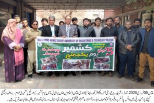 ملتان : محمد نواز شریف یونیورسٹی آف انجینئرنگ اینڈ ٹیکنالوجی ملتان(ایم این ایس یو ای ٹی) میں یومِ کشمیر کے موقع پر کشمیری عوام سے اظہارِ یکجہتی کے لیےیو ای ٹی ملتان میں ایک پُرامن ریلی کا انعقاد کیا گیا۔ریلی میں وائس چانسلر پروفیسر ڈاکٹر توصیف نذاد، رجسٹرارعاصم عمر، فیکلٹی ممبران، یونیورسٹی اسٹاف اور بڑی تعداد میں طلبہ و طالبات نے شرکت کی۔ریلی کے شرکاء نے کشمیر کے حق میں نعرے لگائے اور مقبوضہ کشمیر میں جاری مظالم کی مذمت کی۔ اس موقع پر مقررین نے اپنے خطاب میں کہا کہ کشمیری عوام کی جدوجہد آزادی ایک جائز جدوجہد ہے اور پاکستانی قوم کشمیری بھائیوں کے ساتھ کھڑی ہے۔ریلی کے اختتام پر شرکاء نے اس عزم کا اظہار کیا کہ کشمیر کی آزادی تک جدوجہد جاری رہے گی اور عالمی برادری کشمیری عوام کو ان کا حقِ خودارادیت دلانے میں اپنا کردار ادا کرے۔